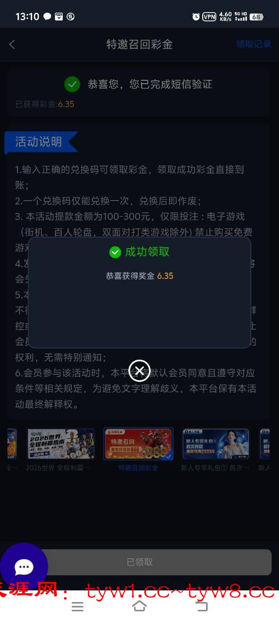 注册完善账户信息,优惠活动中找到特邀彩金,自助验证