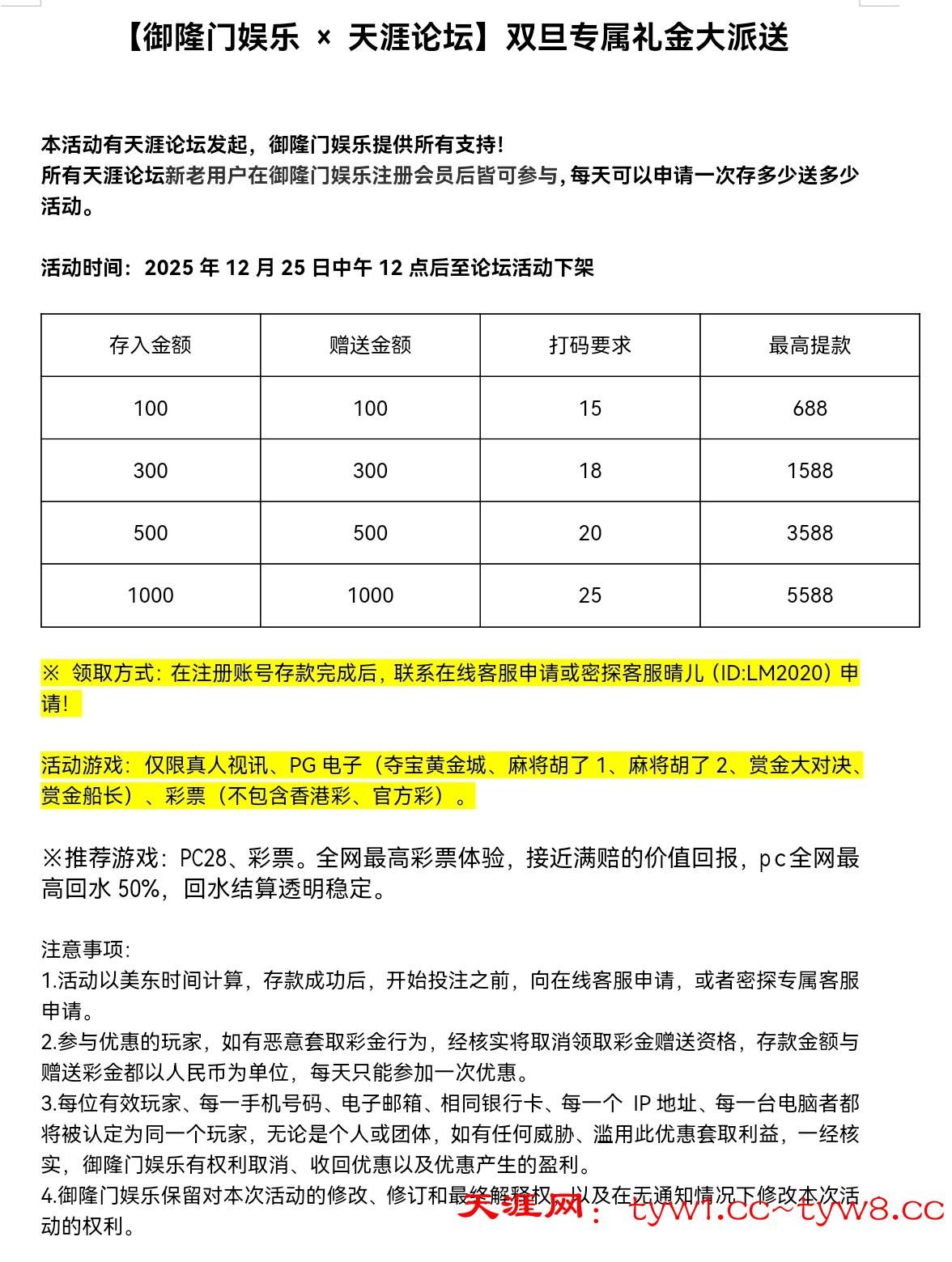 【御隆门娱乐 × 天涯论坛】双旦专属礼金大派送历史回馈58赞助100份好运彩