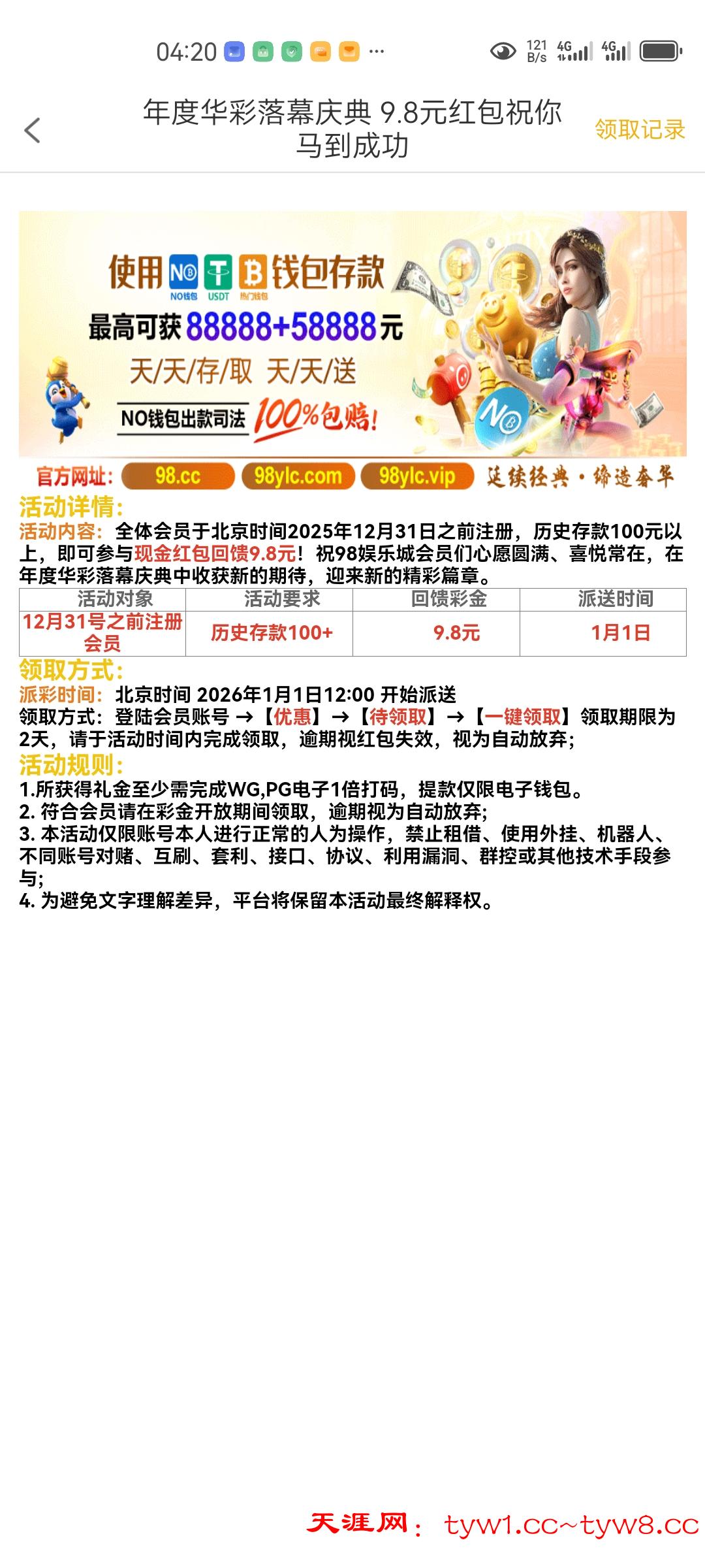 98娱乐城历史回馈送9.8 需要有过100充值才行
