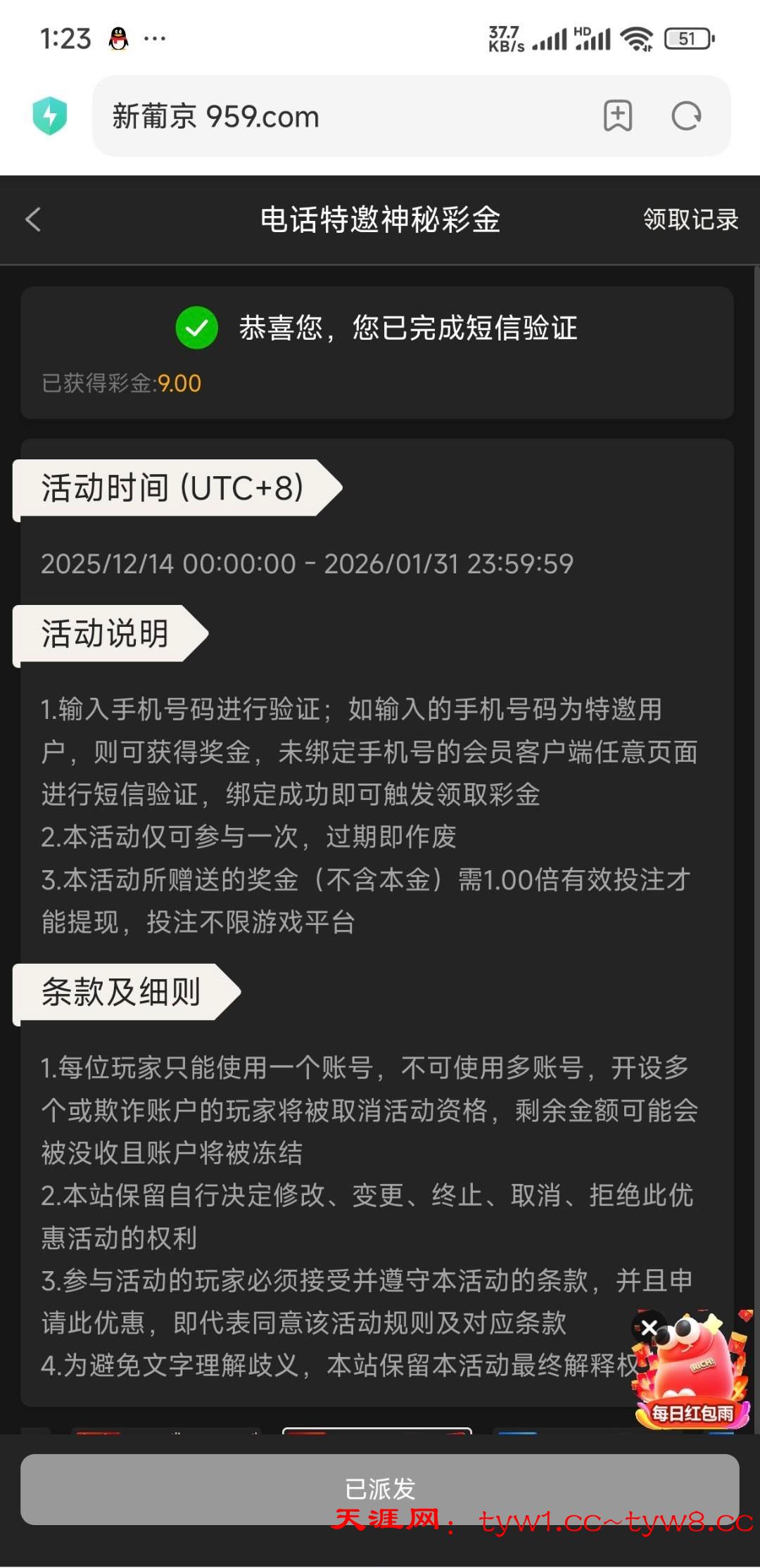 电话彩金送9还行,有点水用手机号注册就自动送了链接959.com