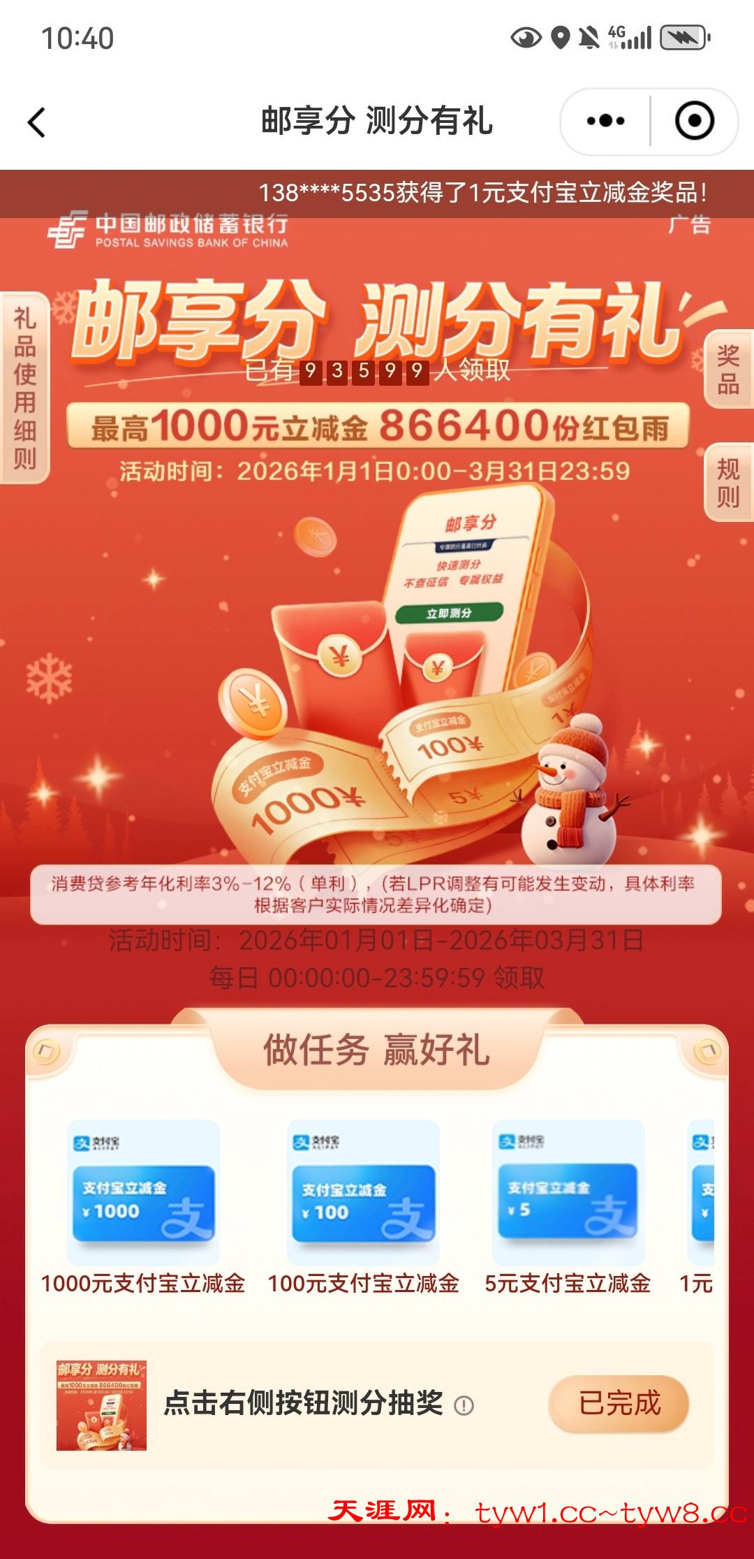【邮储测分/月月有礼抽立减金】