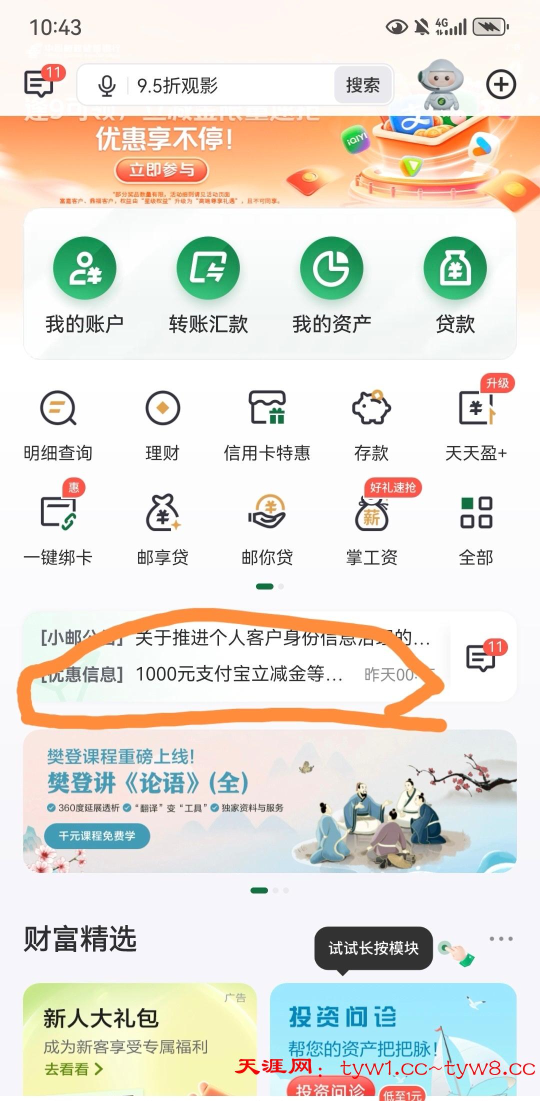 登录邮储APP,首页,找到标记活动,一分钟即可完成1—1000立减金,看运气,别喷,还有我的—生活权益,月月有礼