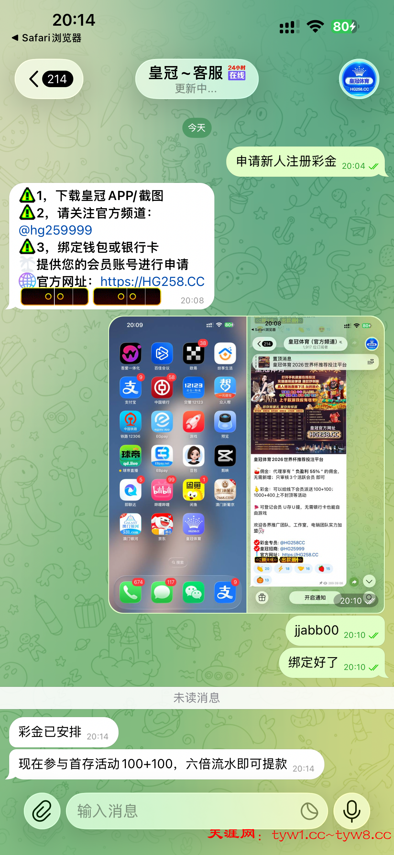 优惠:新人注册送18.88,8水最低提100限制:需要下载APP、关注飞机官方频道、钱包地址或银行卡;最低提100注意事项:直接找彩金专员[@HG258CC]申请新人注册彩金;禁止充值黑款自行承担